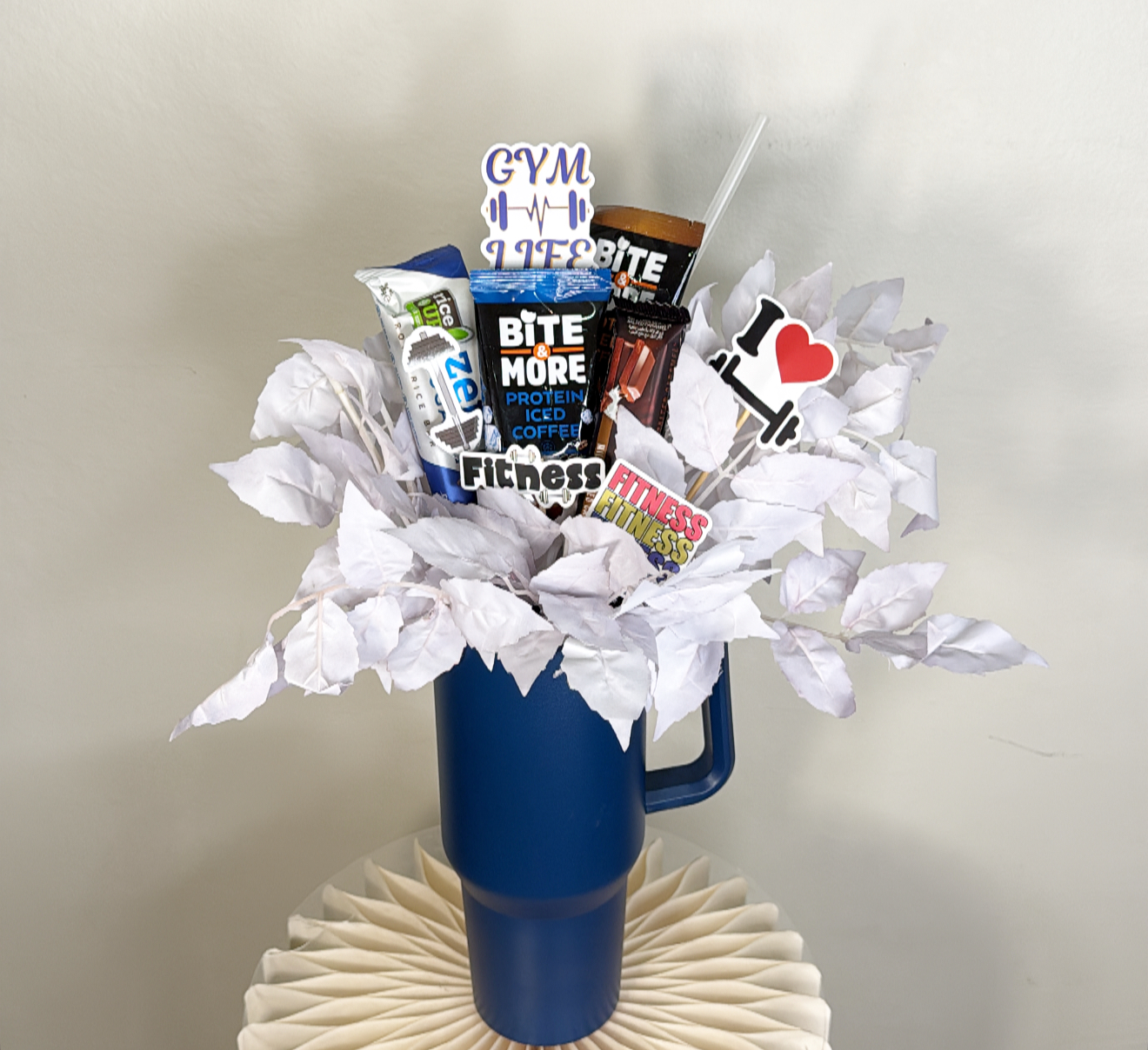 كوب حافظ للحراره بغطاء وعود ومزين بالورد الصناعي .٢ بروتين شيك .٢ بروتين بار .شعار اكرليك حسب المناسبة .كيس وكرت اهداء خاص بالمناسبه .