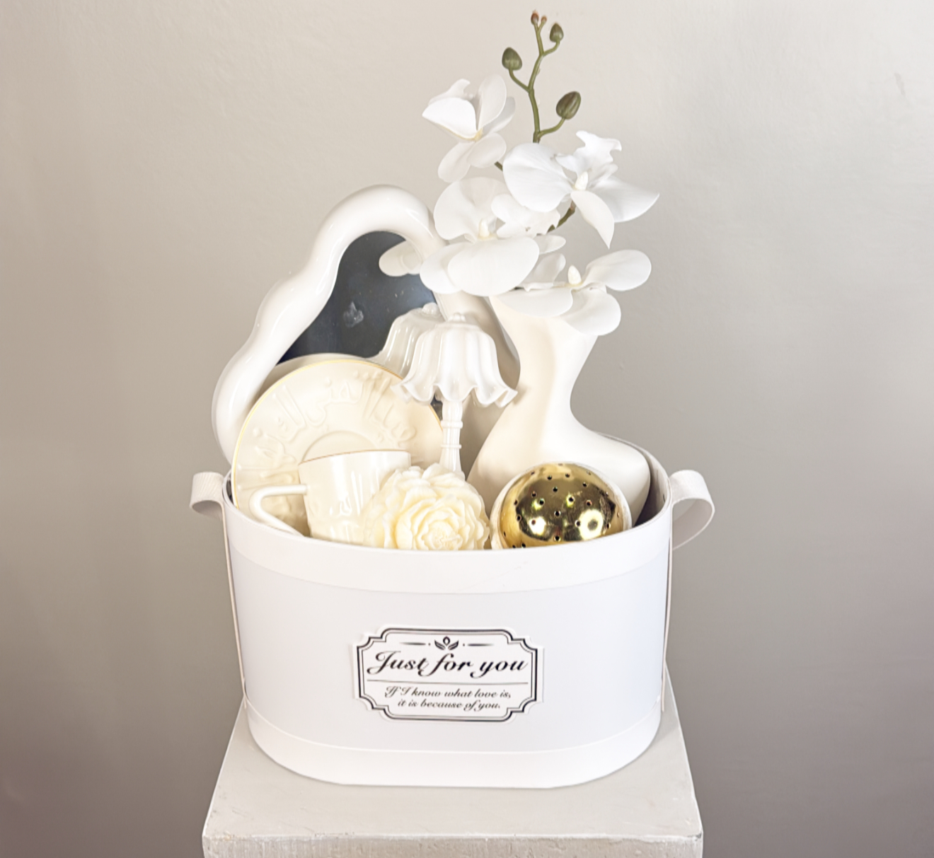 مرايا .فازة اوركيد صناعي .فنجان بصحن بعباره اتمنى لك يوما سعيدا .شمعه معطره .ابجوره مضيئة .مبخر .سله قابله لاعاده الاستخدام .شعار اكرليك حسب المناسبة .كيس وكرت اهداء خاص بالمناسبه .تصل لأحبابكم مغلفه بالتور المعطر .