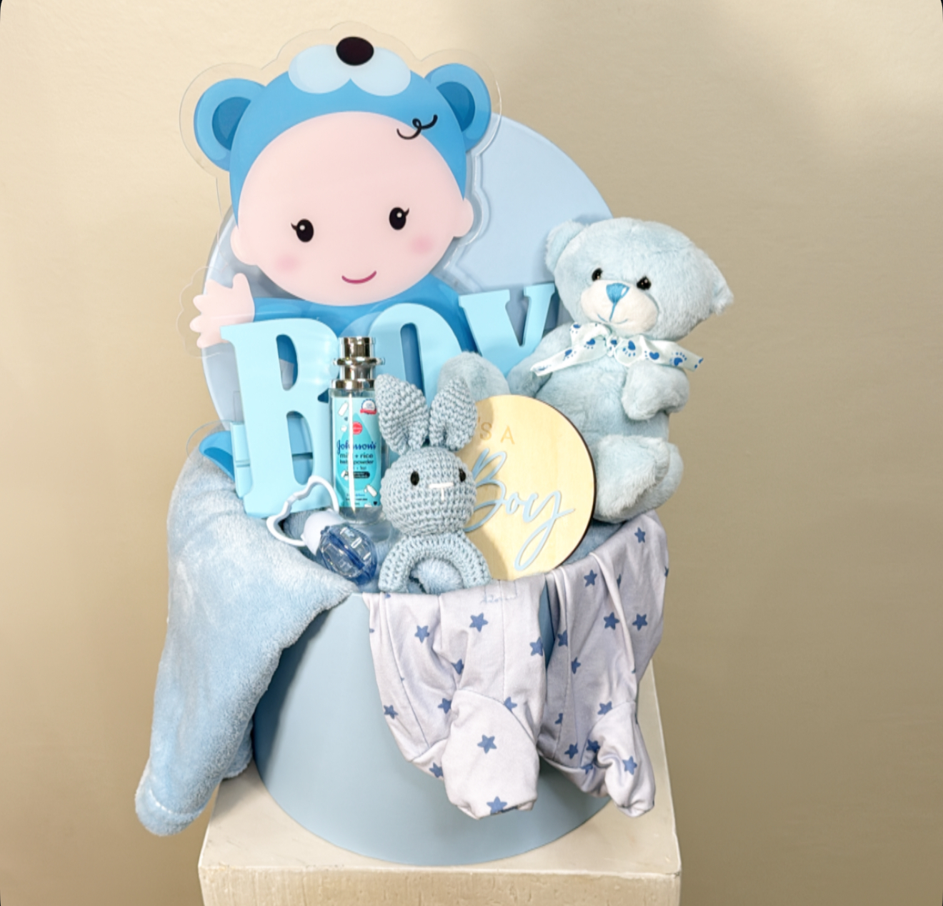 لحاف .افرول بيبي .عطر جونسون .لوح خشبي بعباره it’s a Boy .لهايه - مصاصه .لوح خشبي بعباره boy .ستاند اكرليك شكل بيبي .دميه قطنيه .بوكس بغطاء قابل لاعاده الاستخدام .شعار اكرليك حسب المناسبة .كيس وكرت اهداء خاص بالمناسبه .