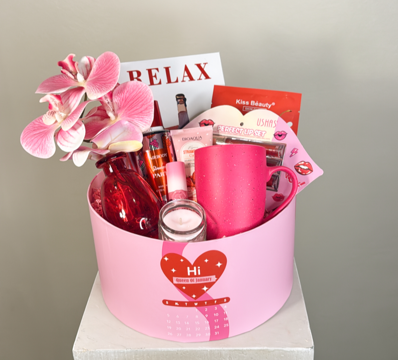 كتاب ديكور .فازه اوركيد صناعي .عطر .ماسك للوجه .شمعه معطره .مرطب للشفاه .كريم لليد .كوب مع شاي الجمال .Lip sticks بثلاث الوان مختلفه .شعار اكرليك حسب المناسبه .كيس وكرت اهداء خاص بالمناسبه .تصل لاحبابكم مغلفه بالتور المعطر .