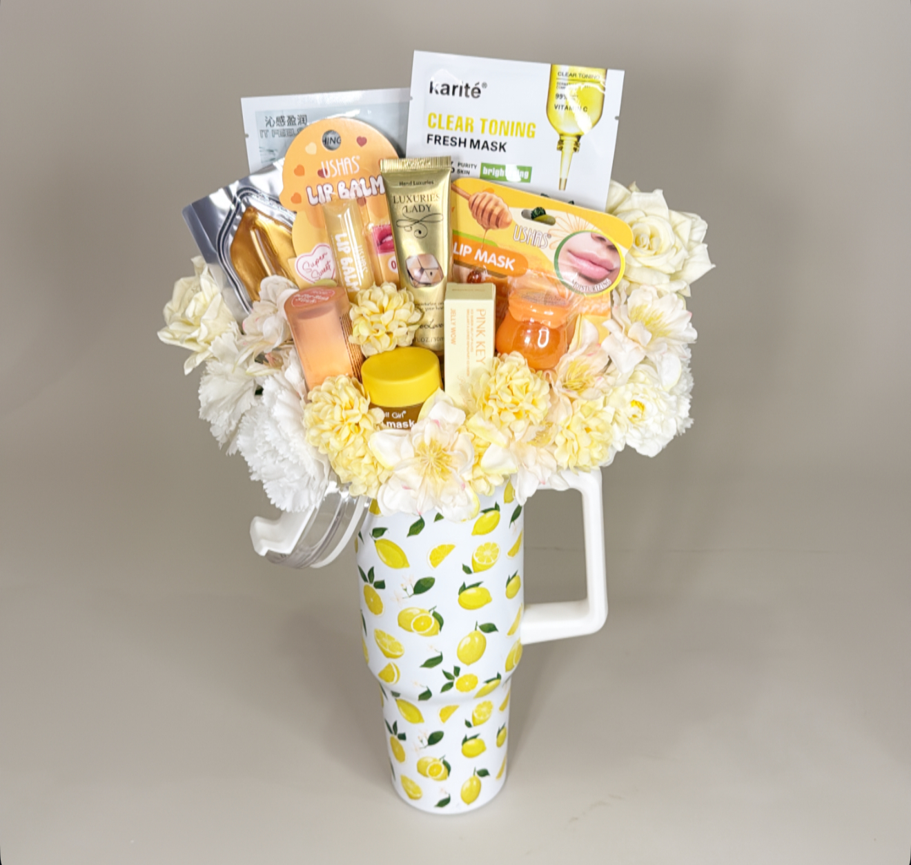 كوب حافظ للحراره بغطاء وعود ومزين بالورد الصناعي .١٠ قطعه متنوعه من منتجات الميك اب والسكن كير .شعار اكرليك حسب المناسبه .كيس وكرت اهداء خاص بالمناسبه .