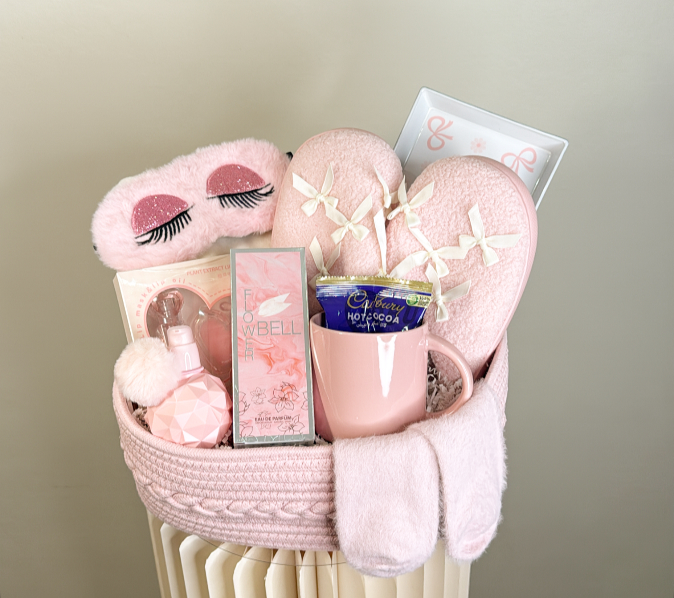 لحاف .حذاء للمنزل .كوب مع مشروب هوت جوكلت .مرطب ومورد للشفاه .غطاء للعين .جوارب .صنيه تقديم .عطر .كريم للجسم .سله قابله لاعاده الاستخدام .شعار اكرليك حسب المناسبة .كيس وكرت اهداء خاص بالمناسبه .تصل لاحبابكم مغلفه بالتور المعطر .