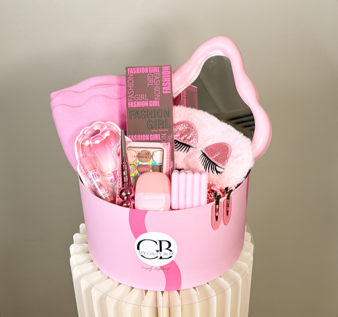لحاف .غطاء للعين .عطر .باليت ميك اب متنوع .ايلاينر على شكل دب .مرطب للشفاه .كريم لليد .٢ كلبس للشعر .مرايا .شمعه مضيئه .شعار اكرليك حسب المناسبه .كيس وكرت اهداء خاص بالمناسبه .تصل لاحبابكم مغلفه بالتور المعطر .