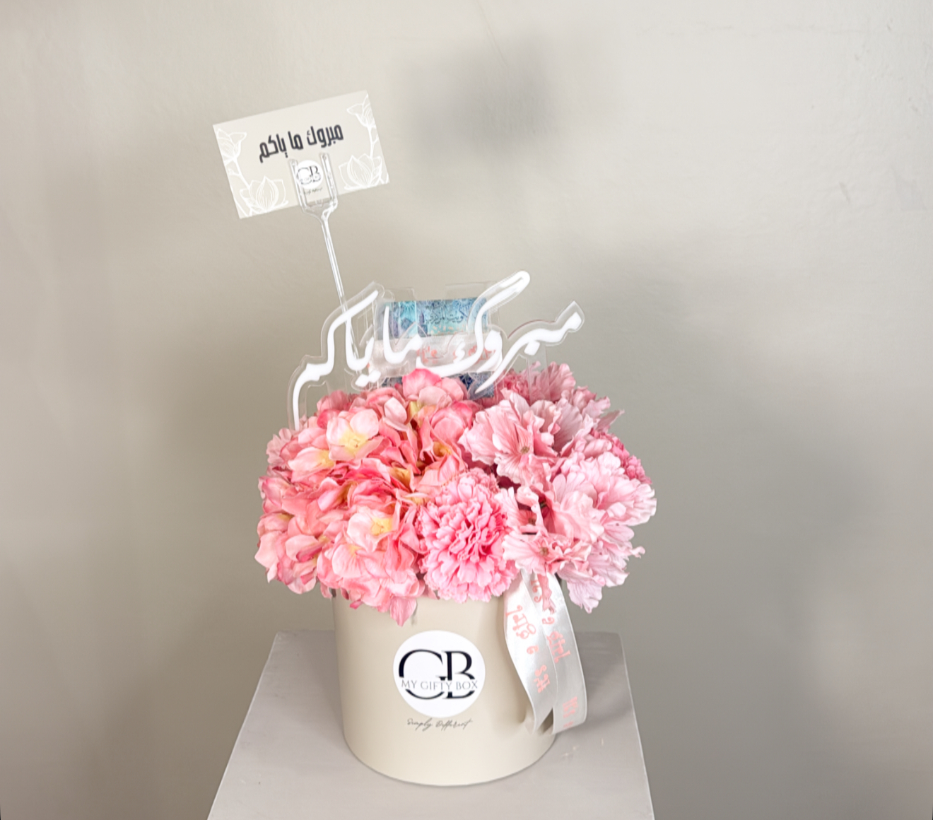 بوكس دائري مزين بالورد الصناعي .علبه اكرليك للمبلغ المالي .يمكن اضافه المبلغ المالي حسب الرغبه .شعار اكرليك مبروك ما ياكم / مبروك اللافي .كيس وكرت اهداء خاص بالمناسبه .