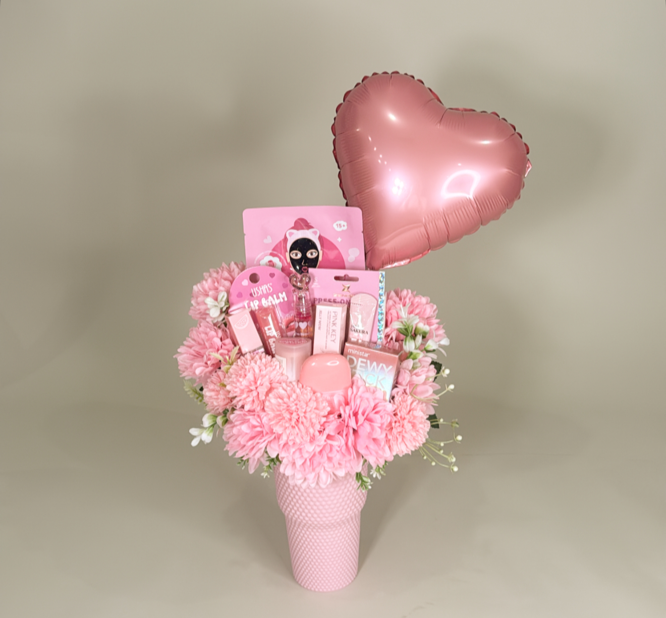كوب حافظ للحراره بغطاء وعود ومزين بالورد الصناعي .١٠ قطع متنوعه من منتجات الميك اب والسكن كير .بالون على شكل قلب حب .شعار اكرليك حسب المناسبه .كيس وكرت اهداء خاص بالمناسبه .