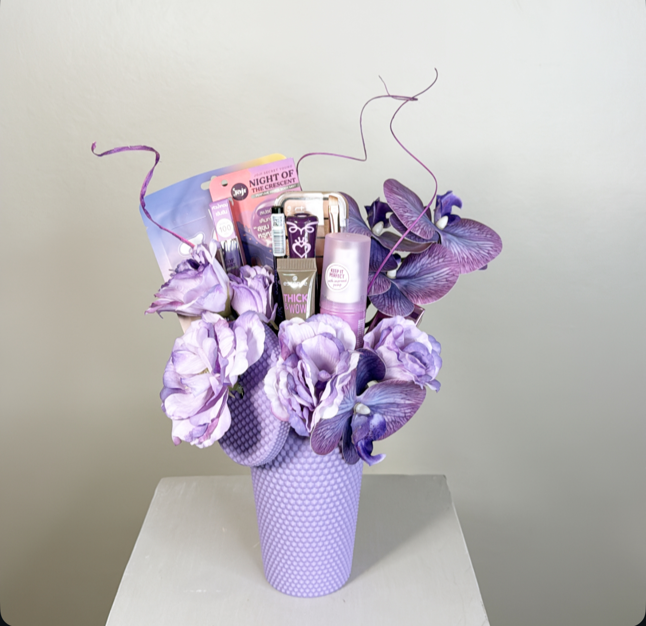 كوب بغطاء وعود ومزين بالورد الصناعي .٩ قطع متنوعه مابين منتجات الميك اب والسكن كير .شعار اكرليك حسب المناسبة .كيس وكرت اهداء خاص بالمناسبه .