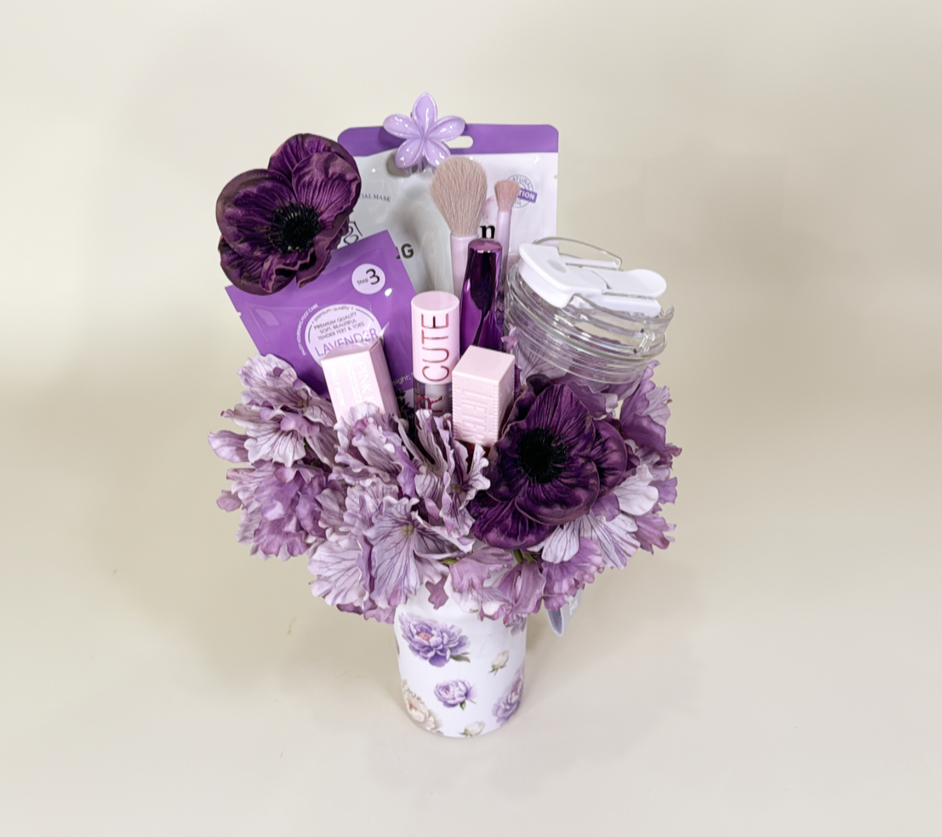 كوب حافظ للحراره بغطاء وعود ومزين بالورد الصناعي يحتوي على :١٠ قطع متنوعه من منتجات الميك اب والسكن كير وكلبس للشعر .شعار اكرليك حسب المناسبه .كيس وكرت اهداء خاص بالمناسبه .