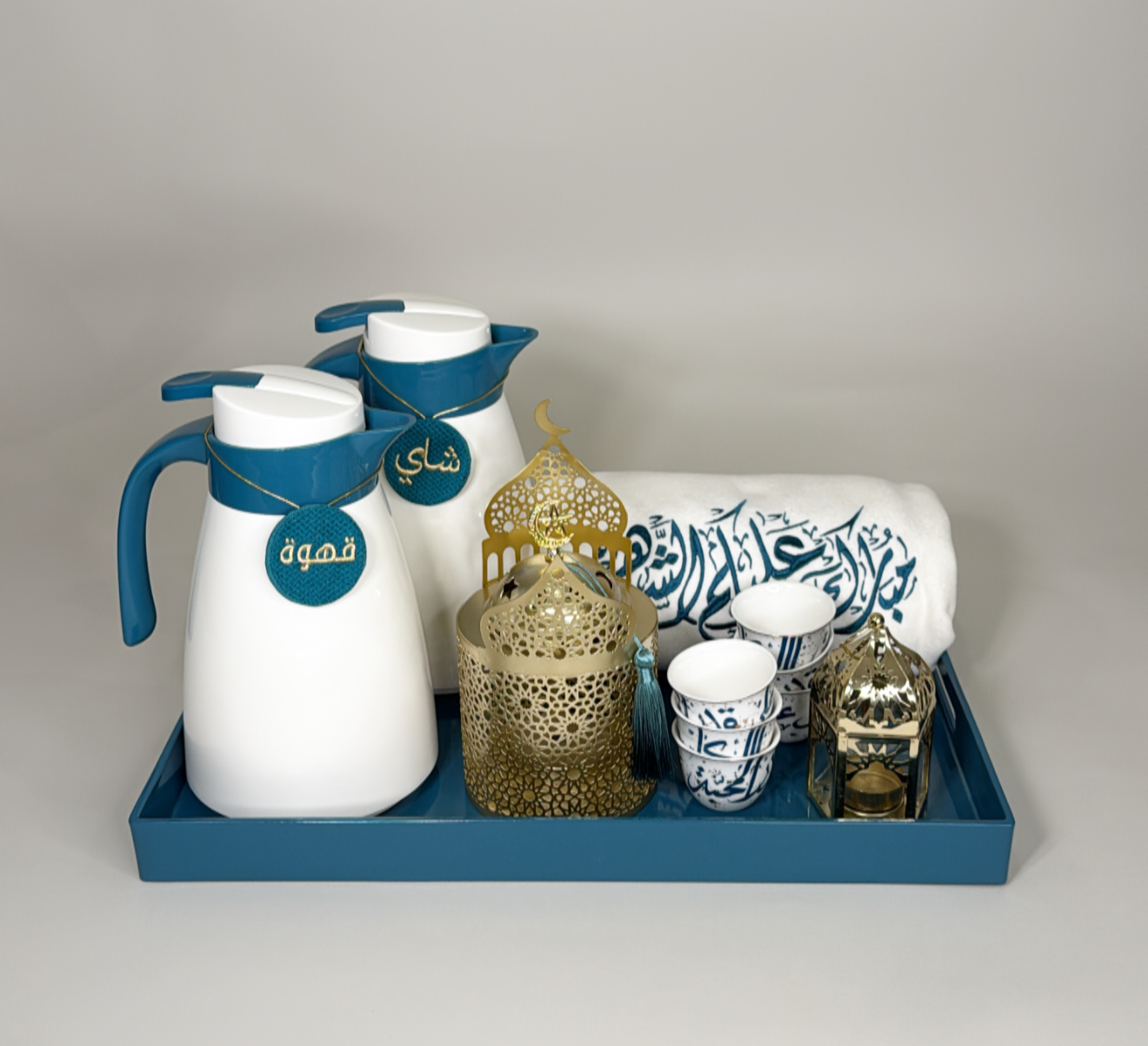 صنيه تقديم مستطيله .٢ مطارة حافظه للحراره مع تعليقه للشاي وقهوه .٦ فناجيل قهوه .مبخر مضيء .ثرو تطريز بعباره مبارك عليكم الشهر .فانوس رمضاني .كيس وكرت اهداء خاص بالمناسبه .تصل لأحبابكم مغلفه بالتور المعطر .