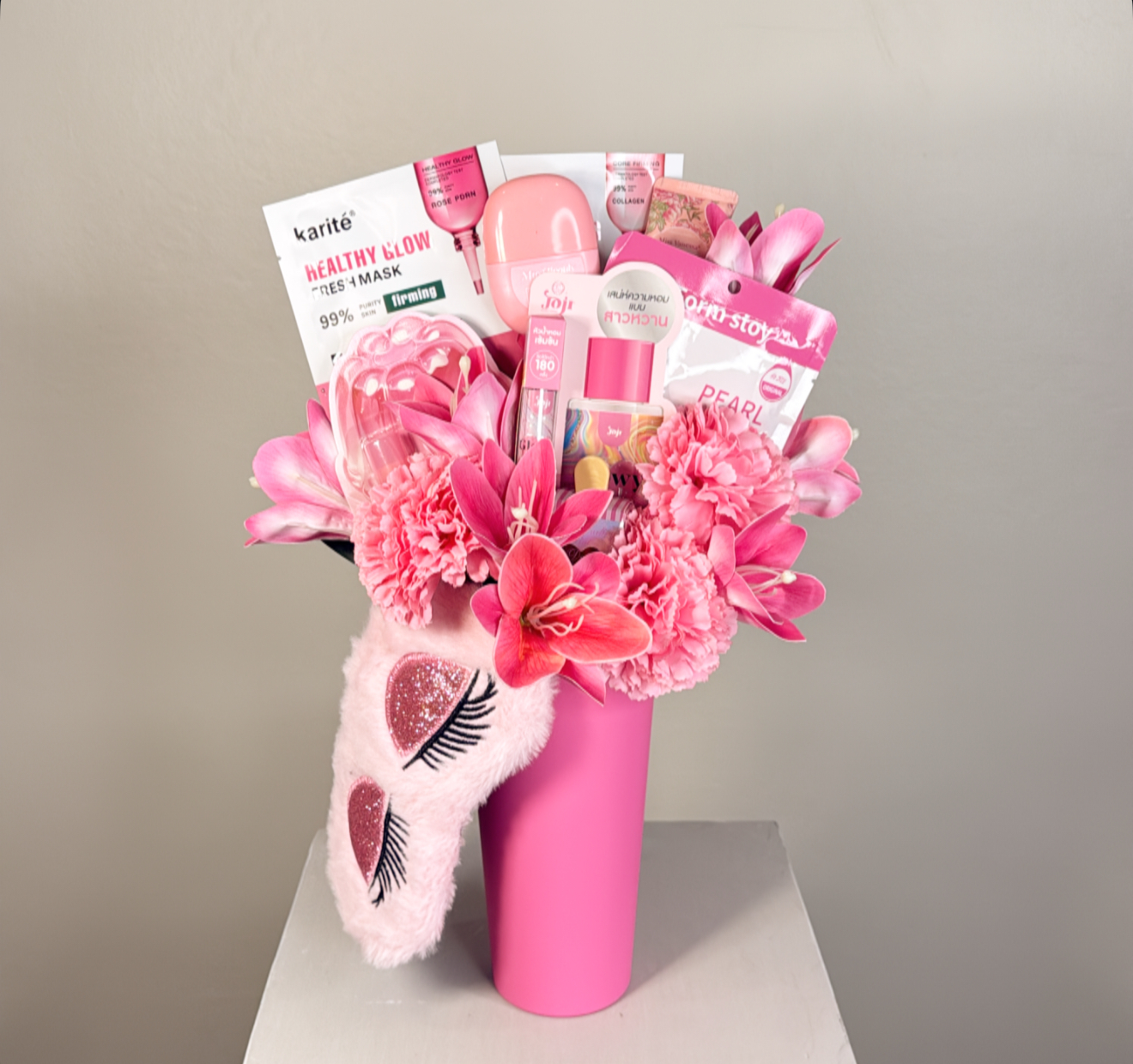 كوب بغطاء وعود ومزين بالورد الصناعي .٨ قطع متنوعه مابين منتجات السكن كير والعنايه الشخصيه .غطاء للعين .شعار اكرليك حسب المناسبة .كيس وكرت اهداء خاص بالمناسبه .