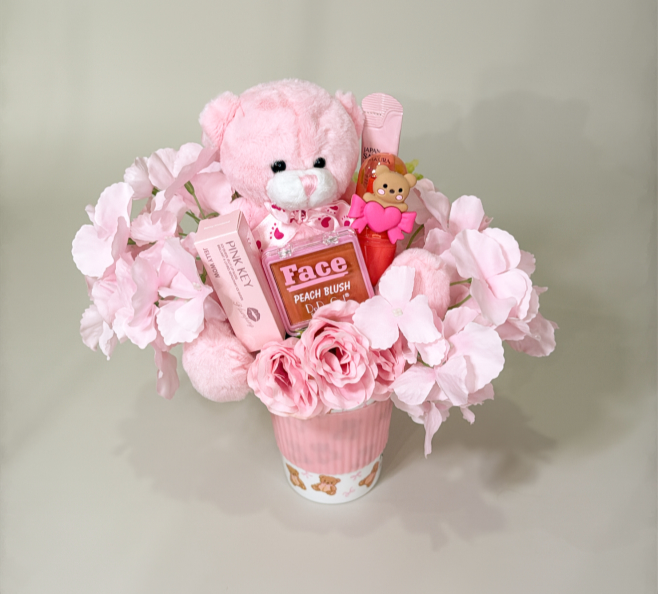 كوب بغطاء مزين بالورد الصناعي يحتوي على :٤ قطع متنوعه من منتجات الميك اب والسكن كير .دميه قطنيه .شعار اكرليك حسب المناسبه .كيس وكرت اهداء خاص بالمناسبه .تصل لاحبابكم مغلفه بالتور المعطر .