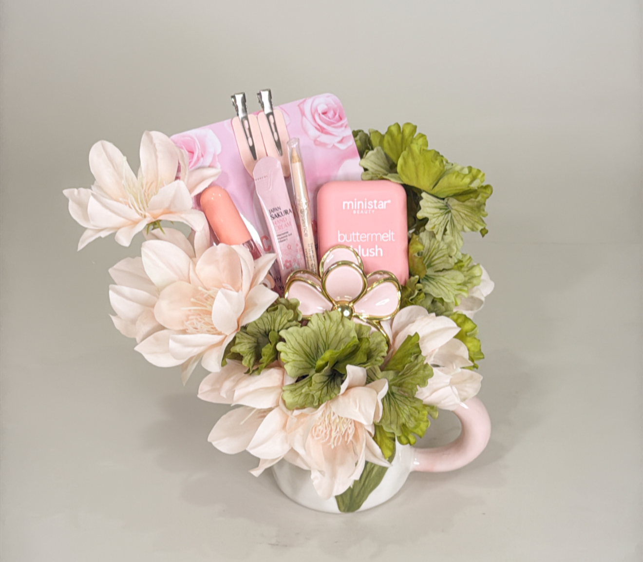 كوب مزين بالورد الصناعي يحتوي على :٧ قطع متنوعه من منتجات السكن كير والميك اب وكلبس للشعر .شعار اكرليك حسب المناسبه .كيس وكرت اهداء خاص بالمناسبه .