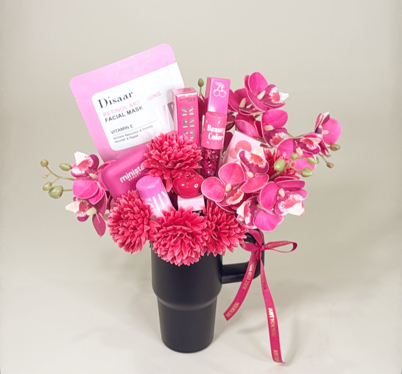 كوب ميني حافظ للحراره بغطاء وعود مزين بالورد الصناعي يحتوي على :٨ قطع متنوعه من منتجات السكن كير والميك اب .شعار اكرليك حسب المناسبه .كيس وكرت اهداء خاص بالمناسبه .