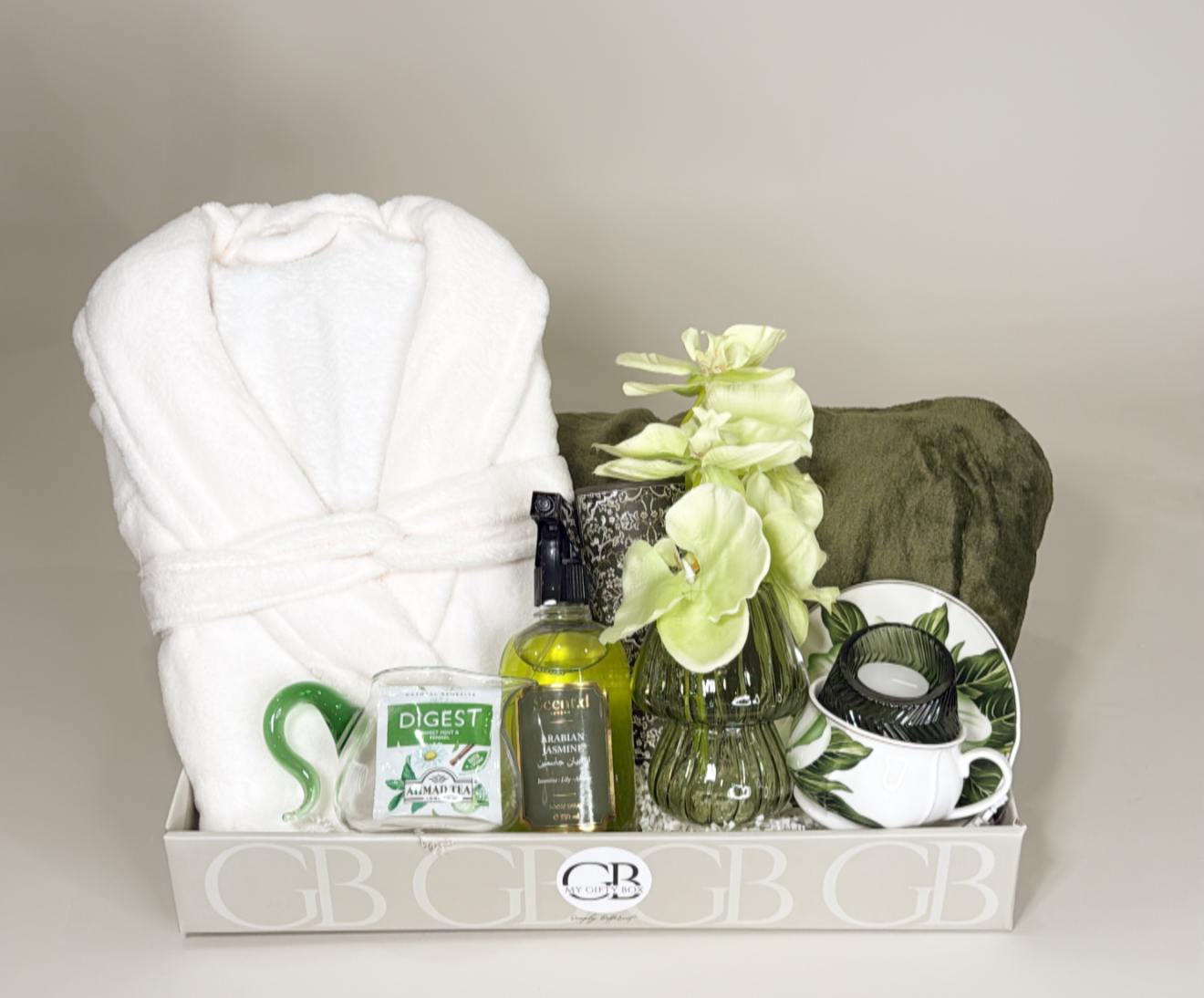 روب منزل قياس فري سايز .لحاف .فازه اوركيد صناعي .شمعه معطره .كوب بصحن مع شاي استرخاء .معطر للجو .إبريق شاي .علبه كلينكس .شعار اكرليك حسب المناسبه .كيس وكرت اهداء خاص بالمناسبه .تصل لاحبابكم مغلفه بالتور المعطر .