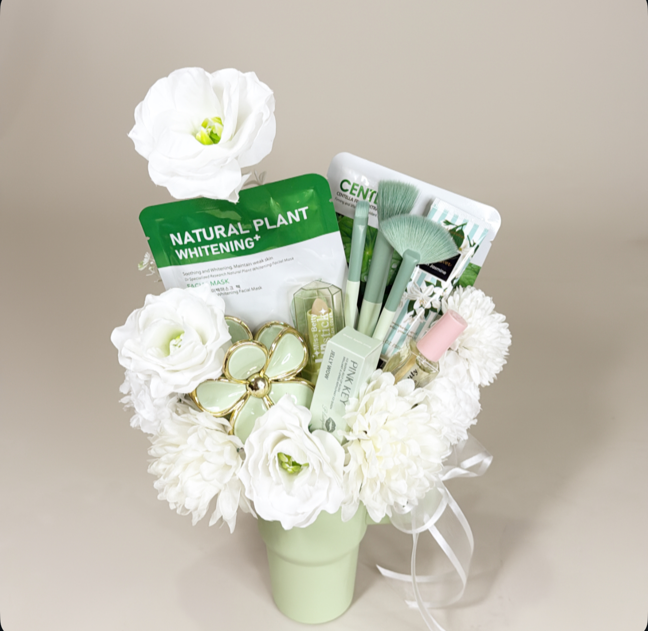 كوب ميني حافظ للحراره بغطاء وعود مزين بالورد الصناعي يحتوي على :٨ قطع متنوعه من منتجات السكن كير والميك اب وفرش الميك اب وكلبس للشعر .شعار اكرليك حسب المناسبه .كيس وكرت اهداء خاص بالمناسبه .