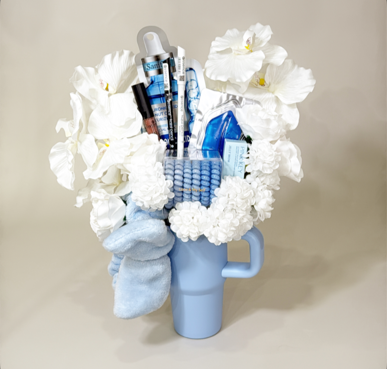 كوب حافظ للحراره بغطاء وعود ومزين بالورد الصناعي يحتوي على :٨ قطع متنوعه من منتجات الميك اب والسكن كير وأدوات العنايه الشخصيه .شعار اكرليك حسب المناسبه .كيس وكرت اهداء خاص بالمناسبه .تصل لاحبابكم مغلفه بالتور المعطر .