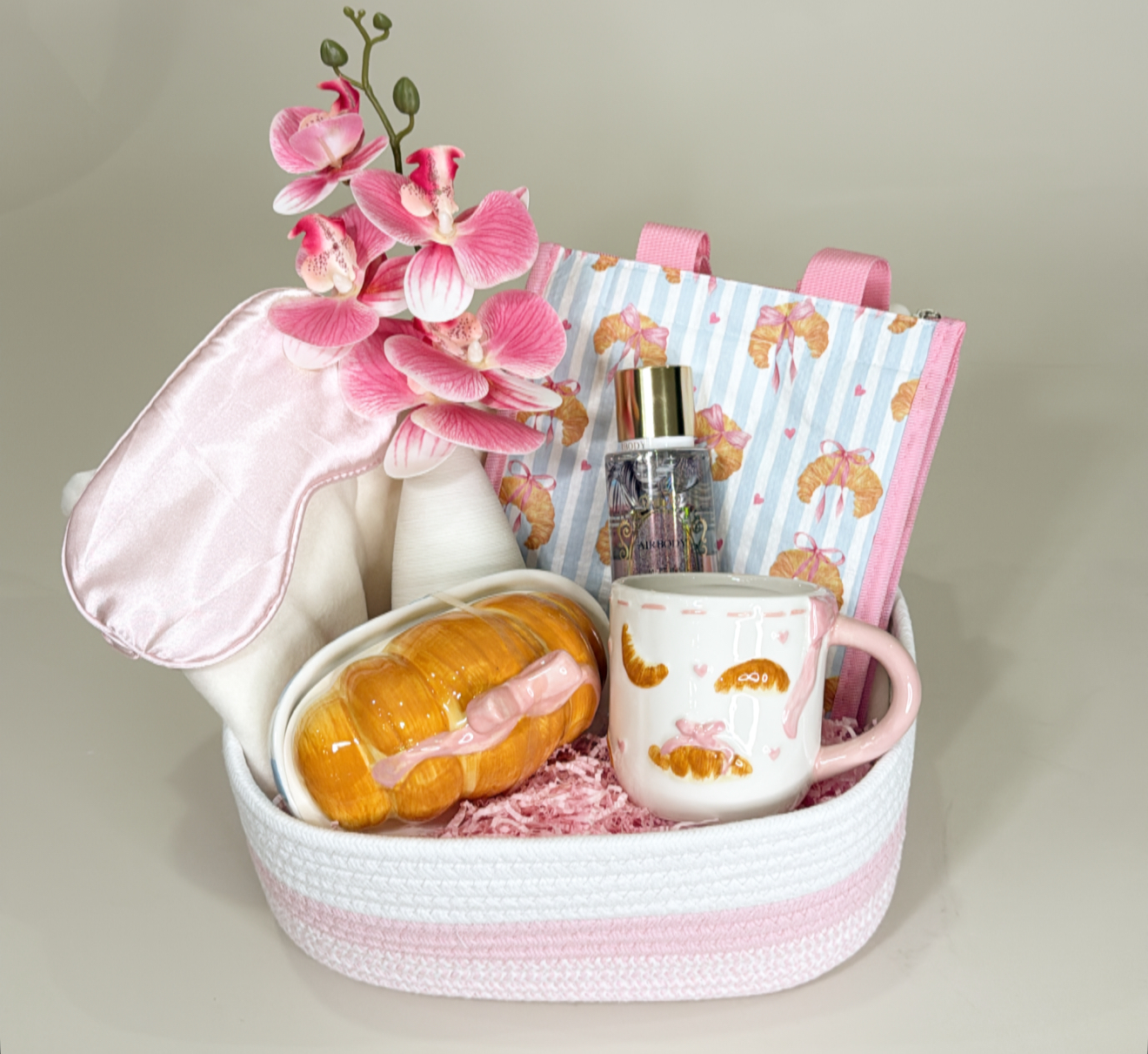 لحاف .غطاء للعين .حقيبه مستلزمات شخصيه .عطر .كوب مع شاي استرخاء .فازه اوركيد صناعي .صحن بغطاء على شكل كرواسون .سله قابله لاعاده الاستخدام .شعار اكرليك حسب المناسبهكيس وكرت اهداء خاص بالمناسبه .