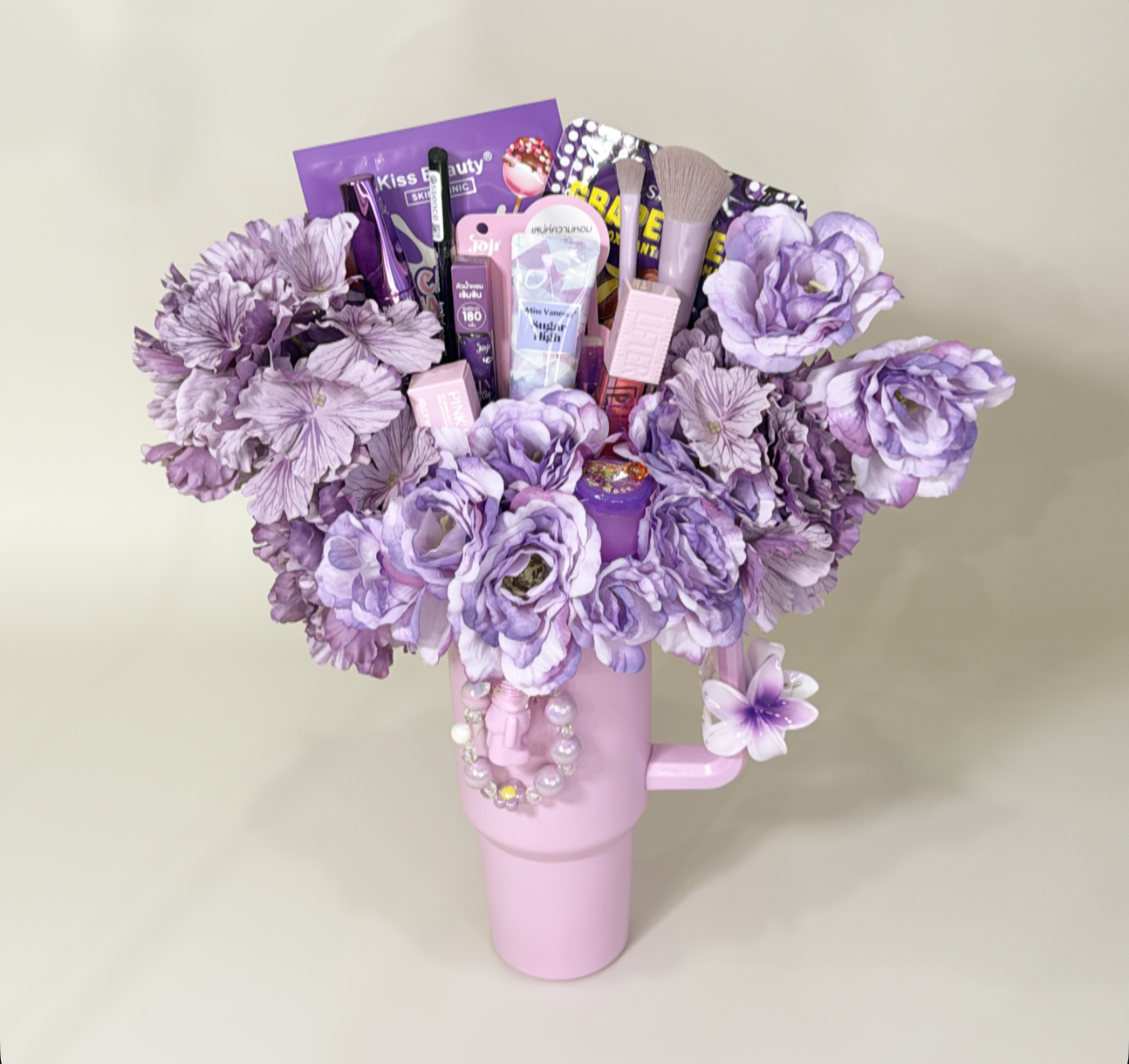 كوب حافظ للحراره بغطاء وعود ومزين بالورد الصناعي يحتوي على :١٣ قطعه متنوعه من منتجات الميك اب والسكن كير وكلبس للشعر .شعار اكرليك حسب المناسبه .كيس وكرت اهداء خاص بالمناسبه .
