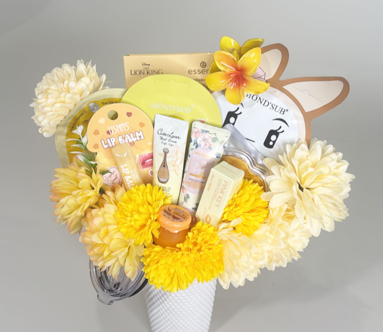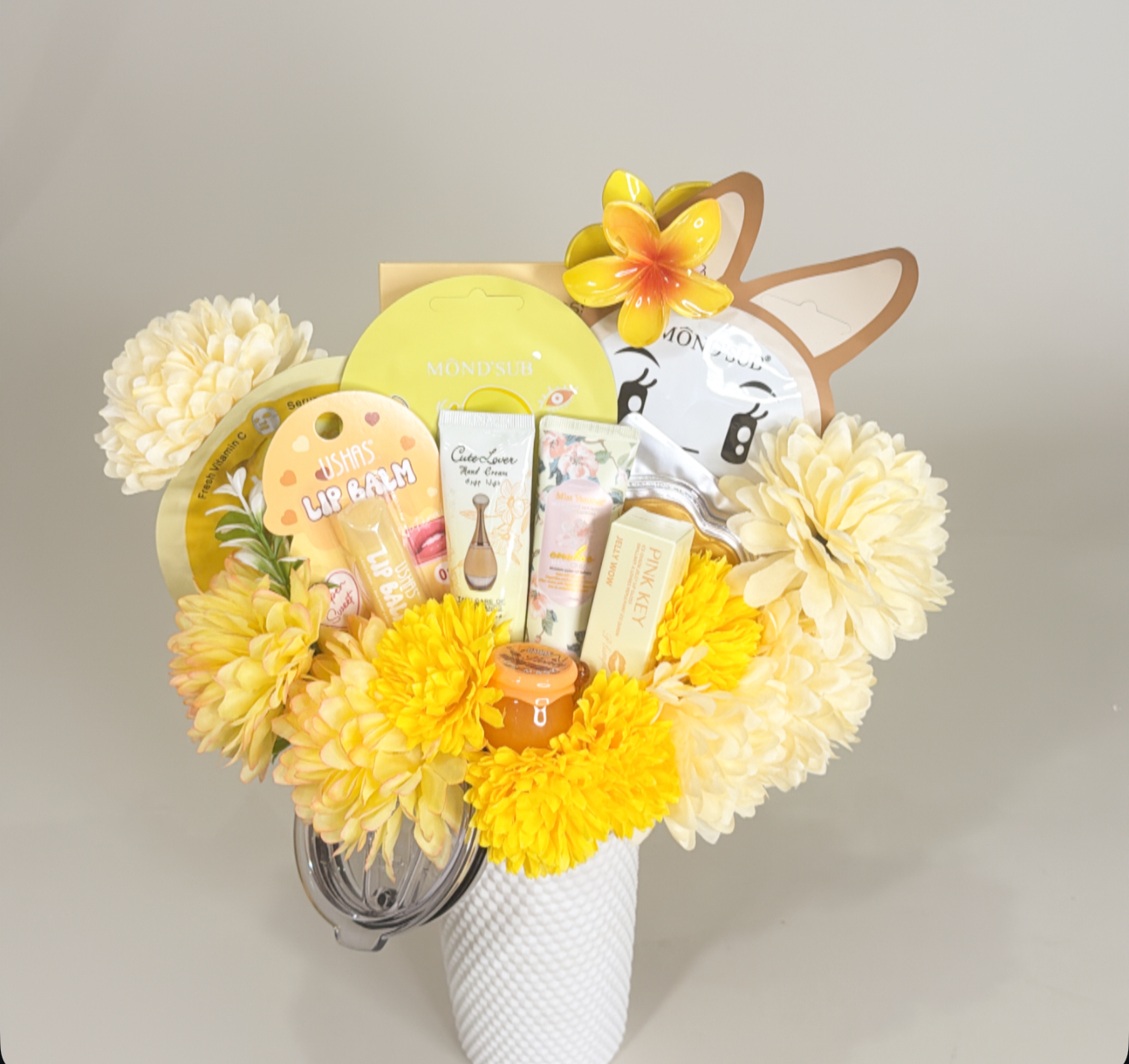 كوب حافظ للحراره بغطاء و مزين بالورد الصناعي يحتوي على :١٢ قطعه متنوعه من منتجات السكن كير والميك اب وكلبس الشعر .شعار اكرليك حسب المناسبه .كيس وكرت اهداء خاص بالمناسبه .